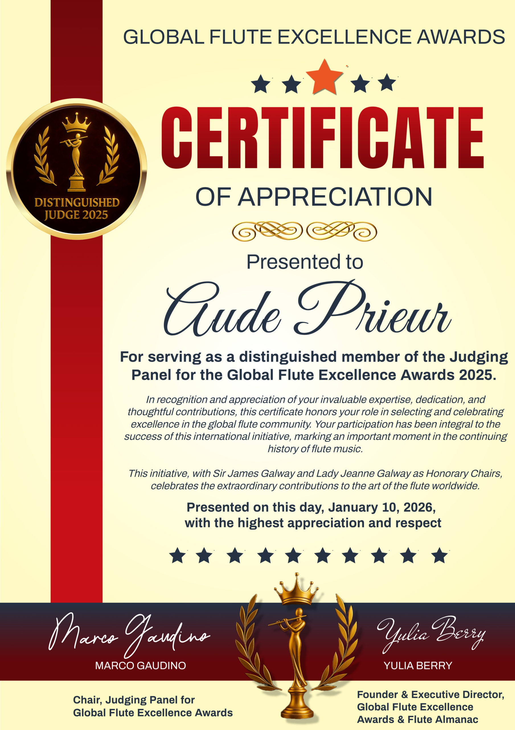 Elle a également été membre du jury du Global Flute Excellence Award 2025.
